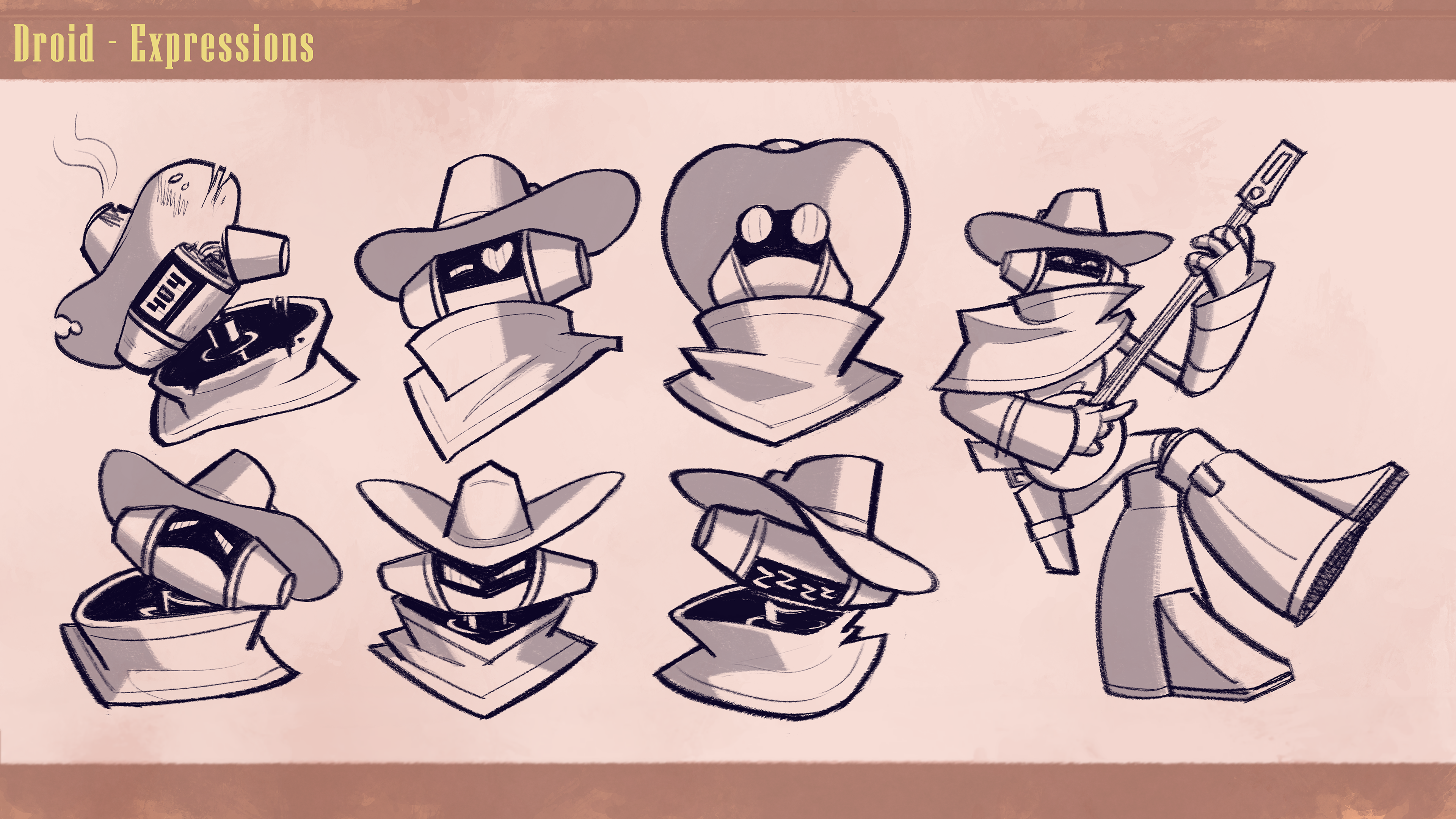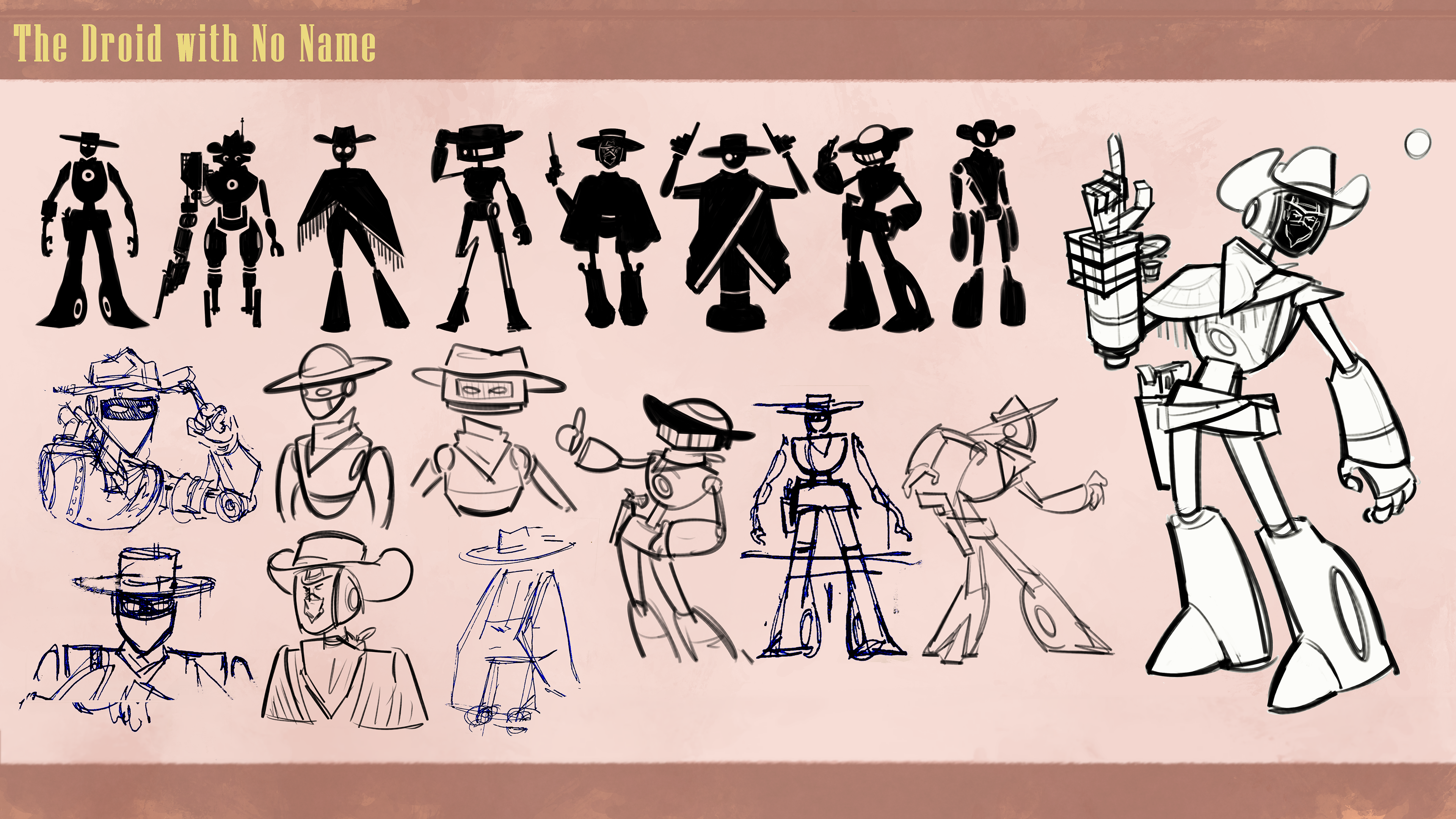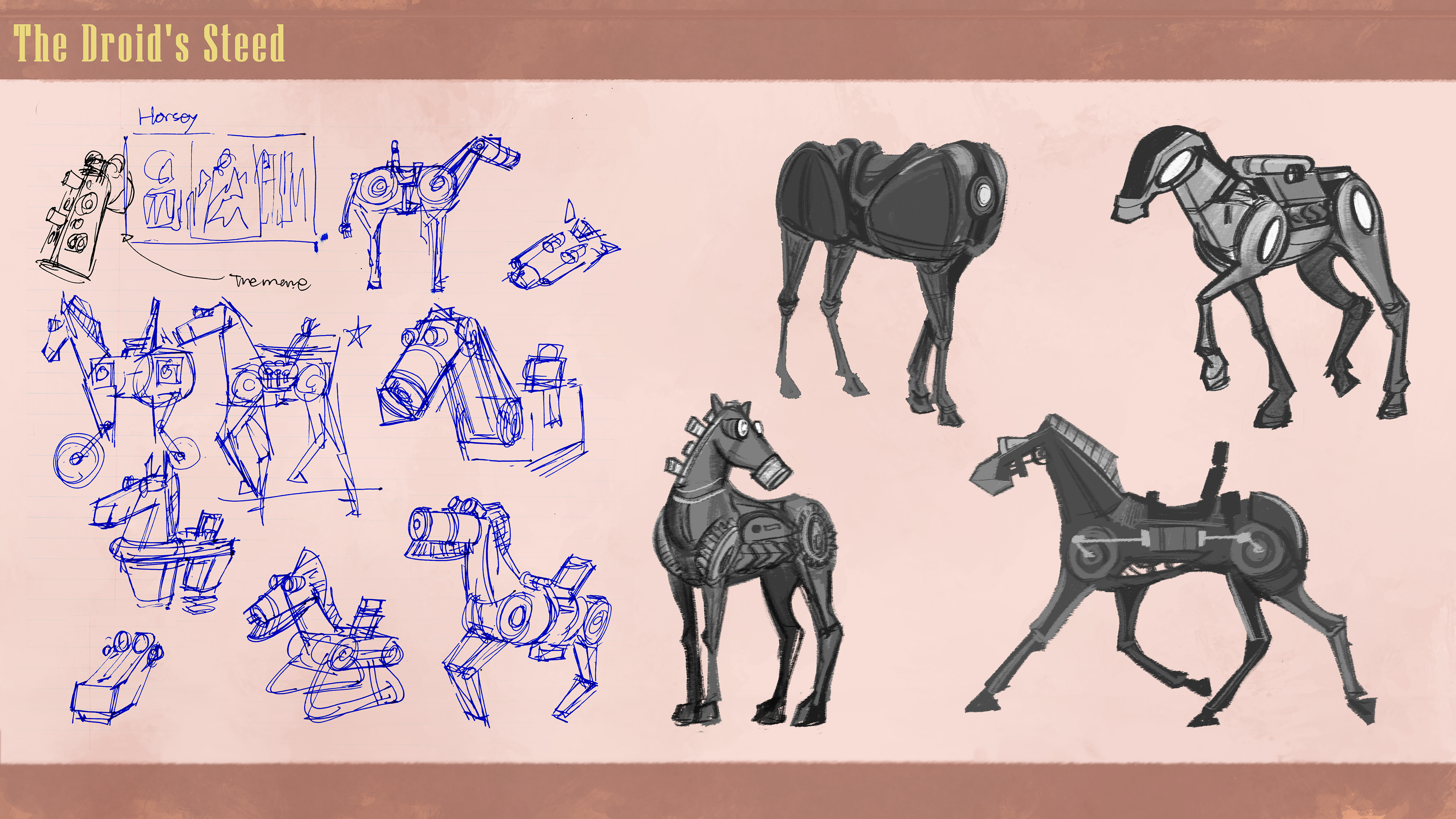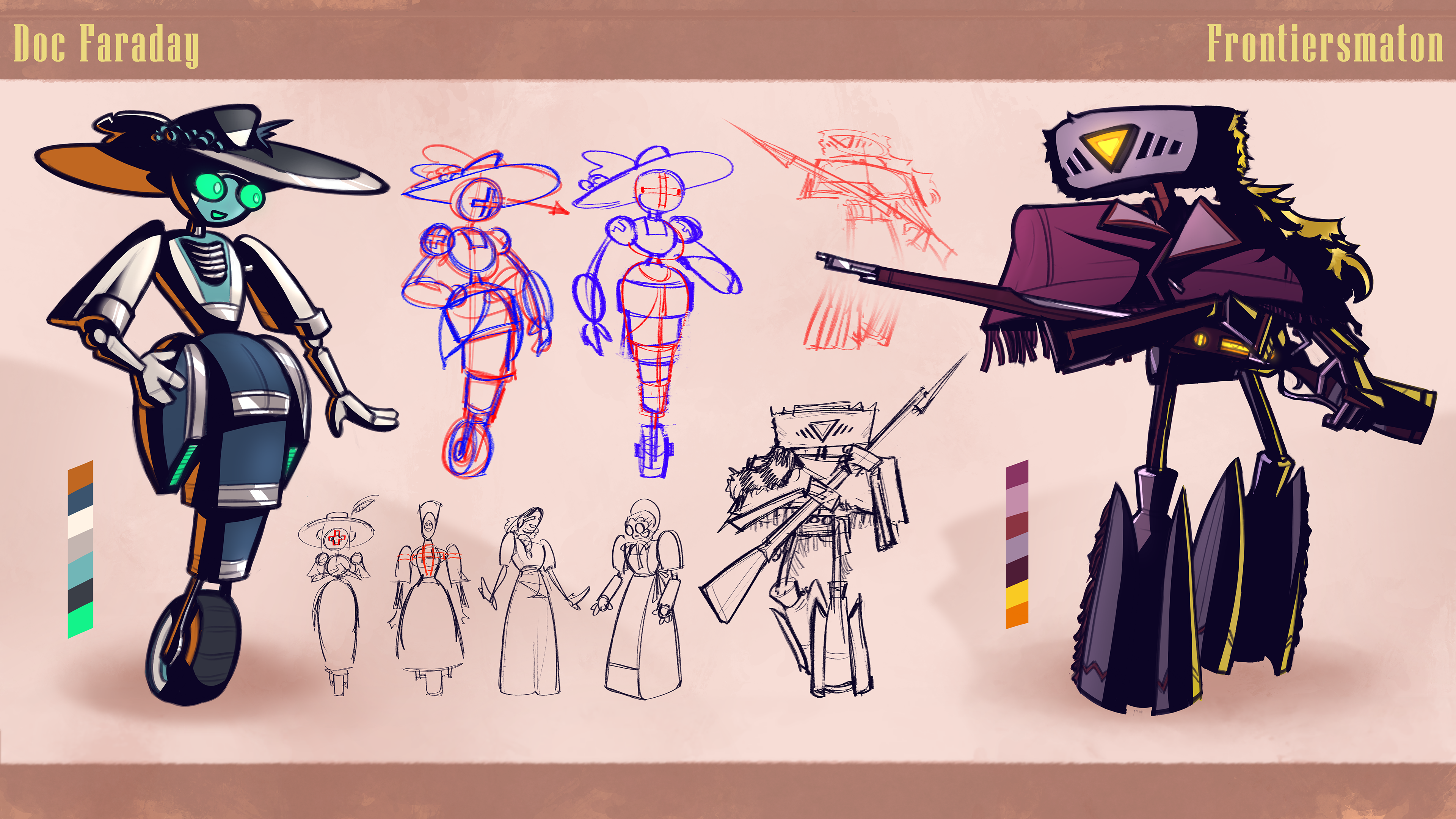 Additional ideations for the Frontiersmaton and Doc Faraday, as well as development of the Droid's steed and revolver.