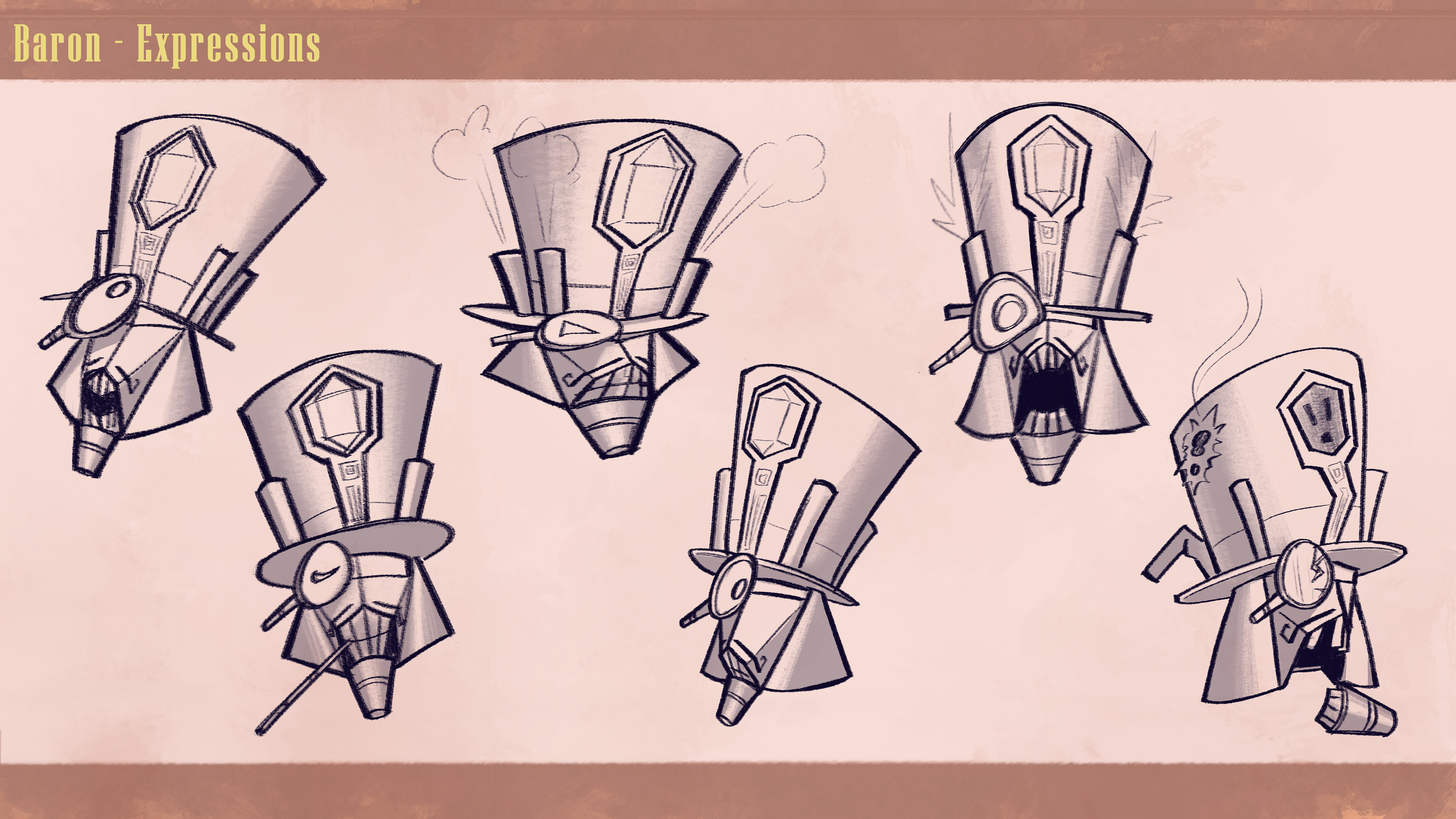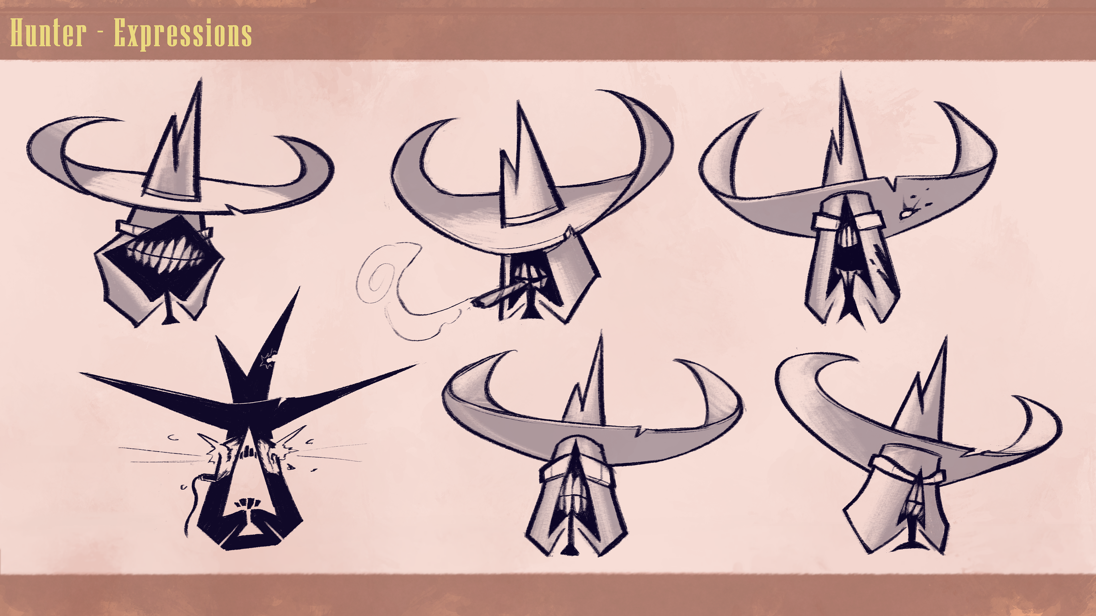 Ideation silhouettes and sketches, expression sheet, and lineart/color passes.
