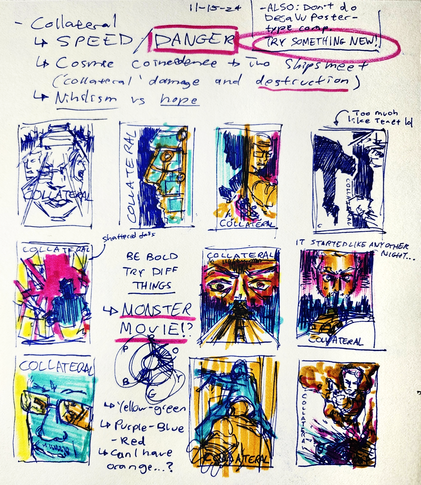 My initial approach to ideating thumbnails for this poster were to emphasize the core genre elements of the film; SPEED and DANGER. I looked at references that ranged from 80's slashers (Jason Takes Manhattan) to various 90's action-thrillers that evoke the same tone.