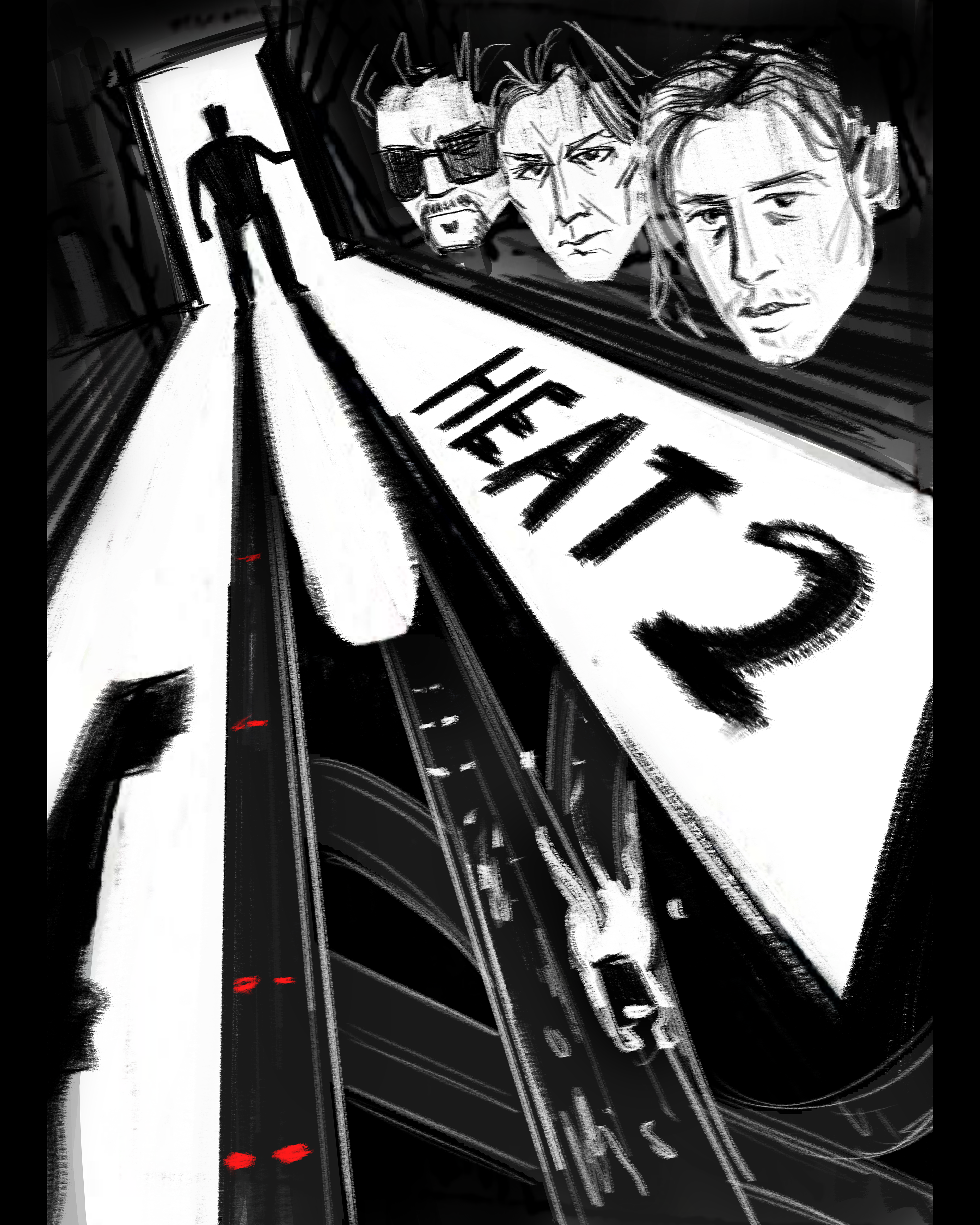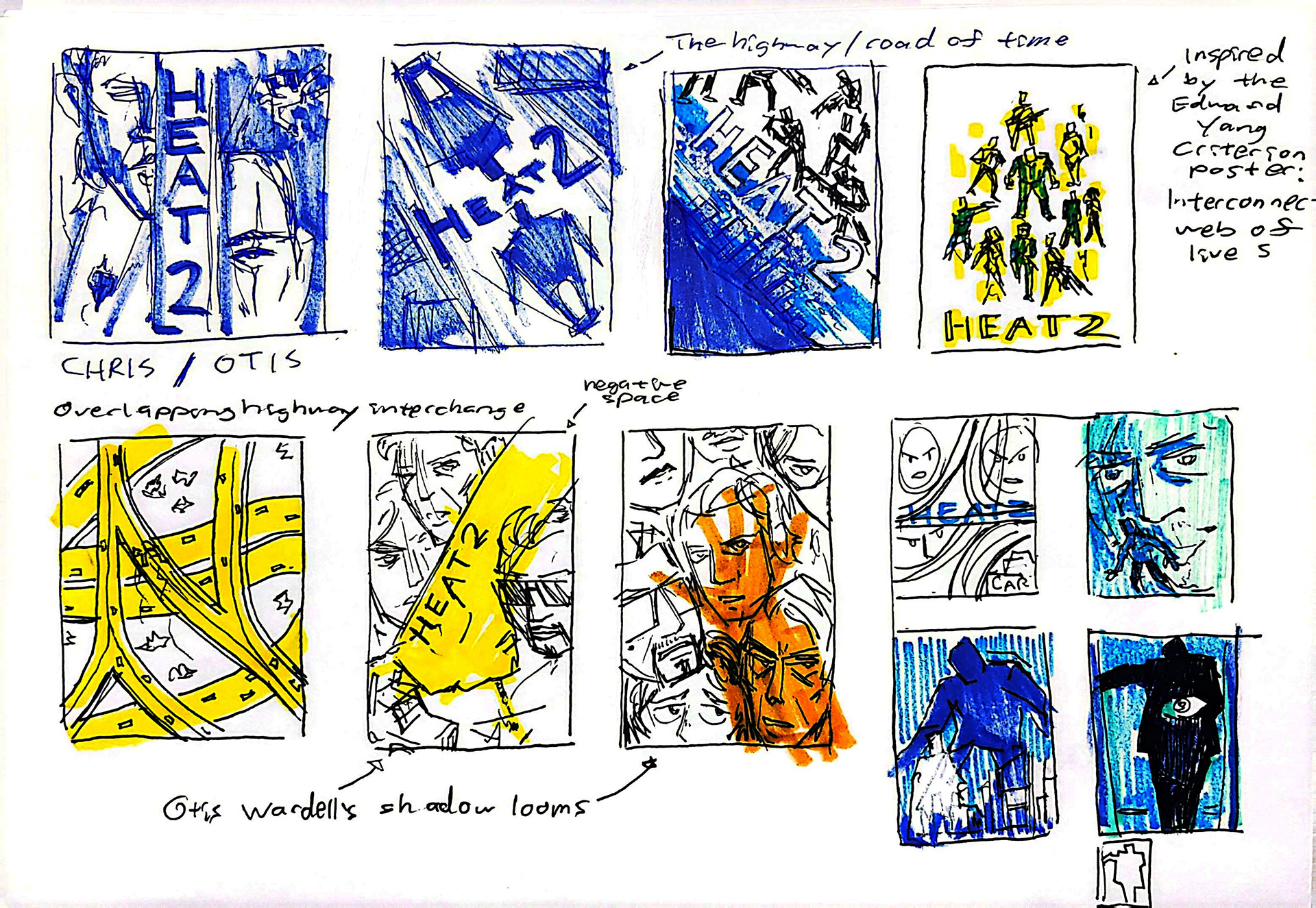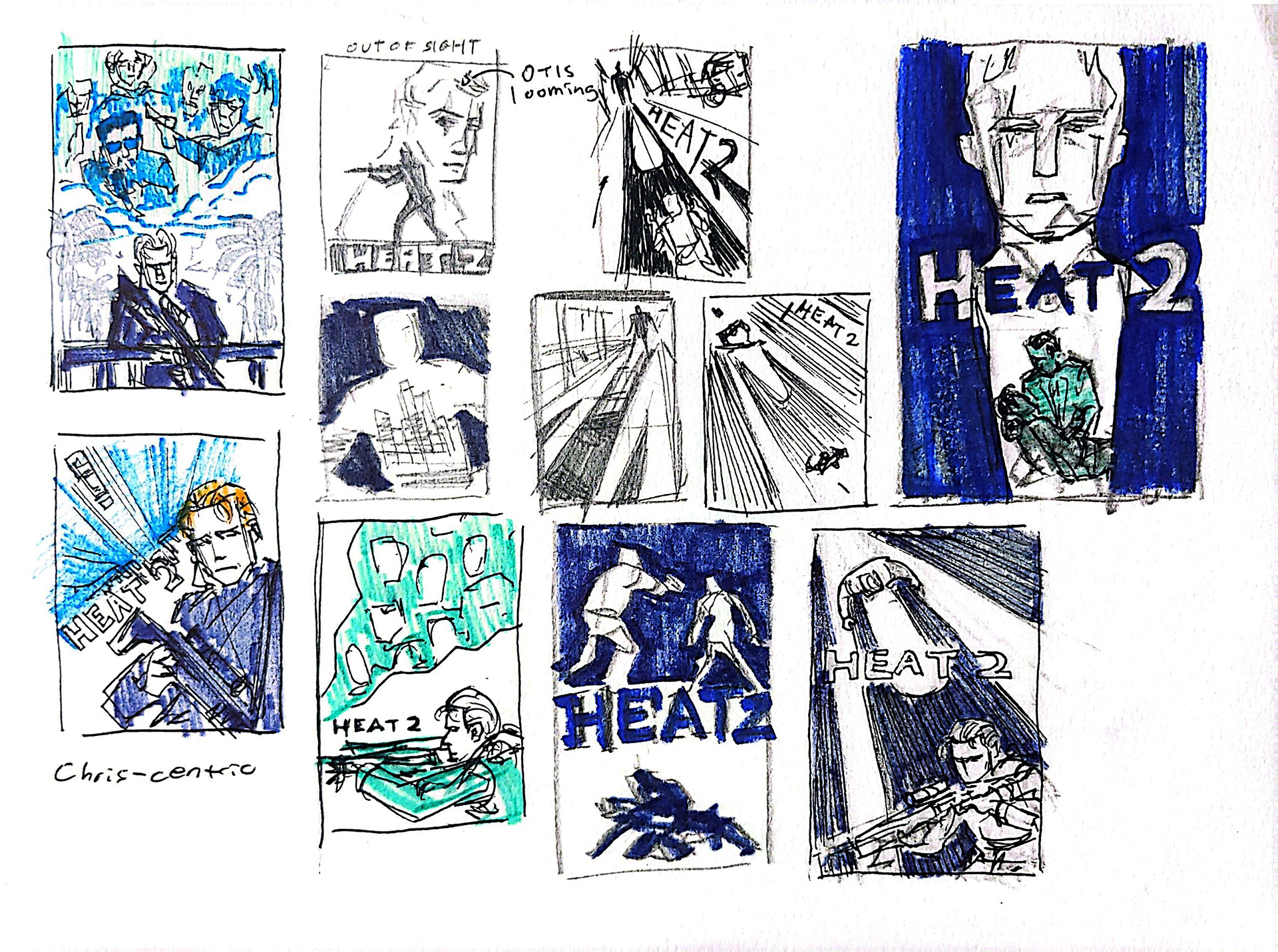 As I began designing thumbnails for the Heat 2 poster, I thought a good amount about which visual elements were essential to the story of 2, and what angle I could take depending on which story element I would focus on.