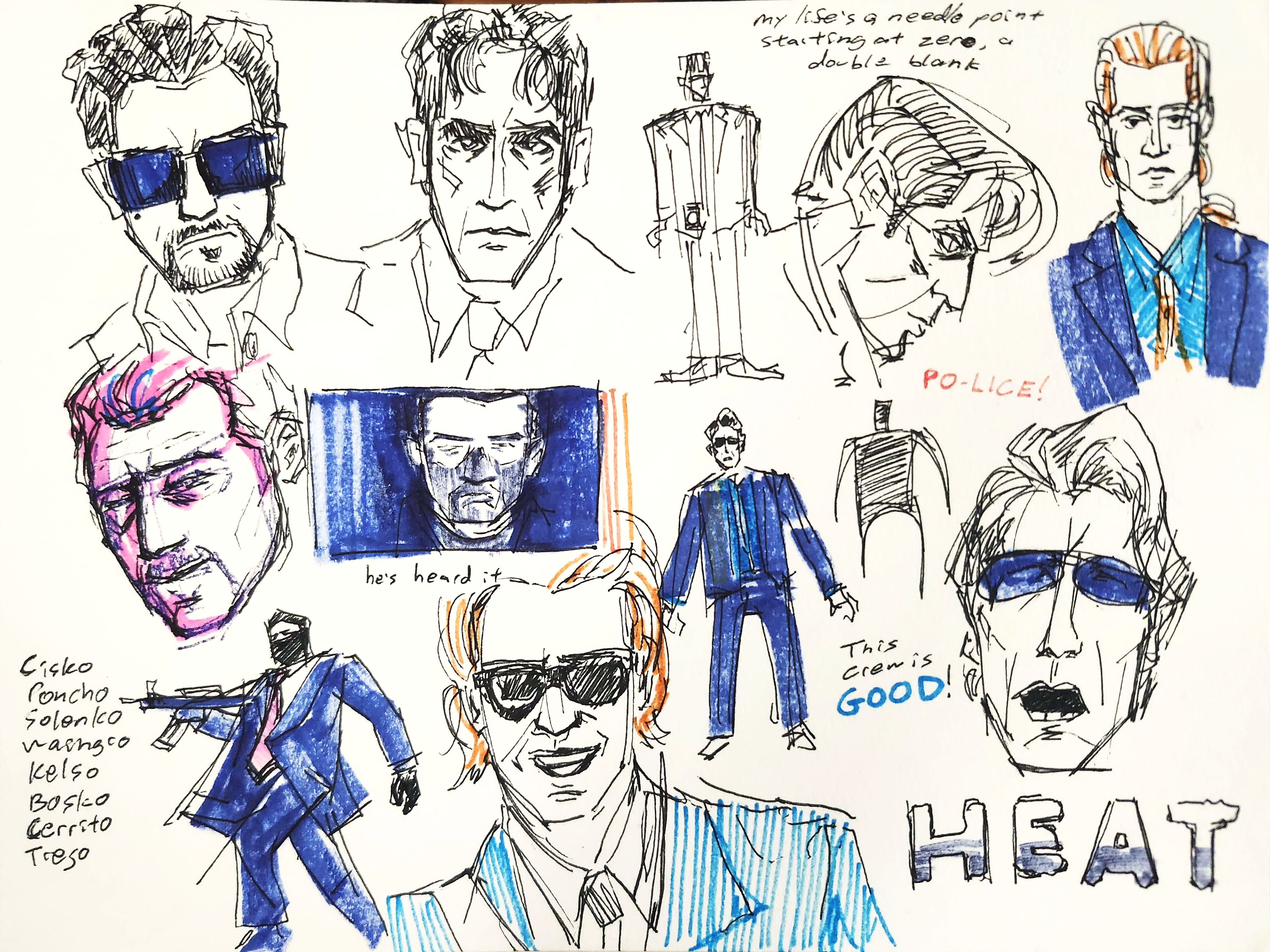 I rewatched Heat and did some sketches in order to get a sense for what kind of style I wanted to use to depict the characters, as well as just getting a general sense of how to capture their likeness.
