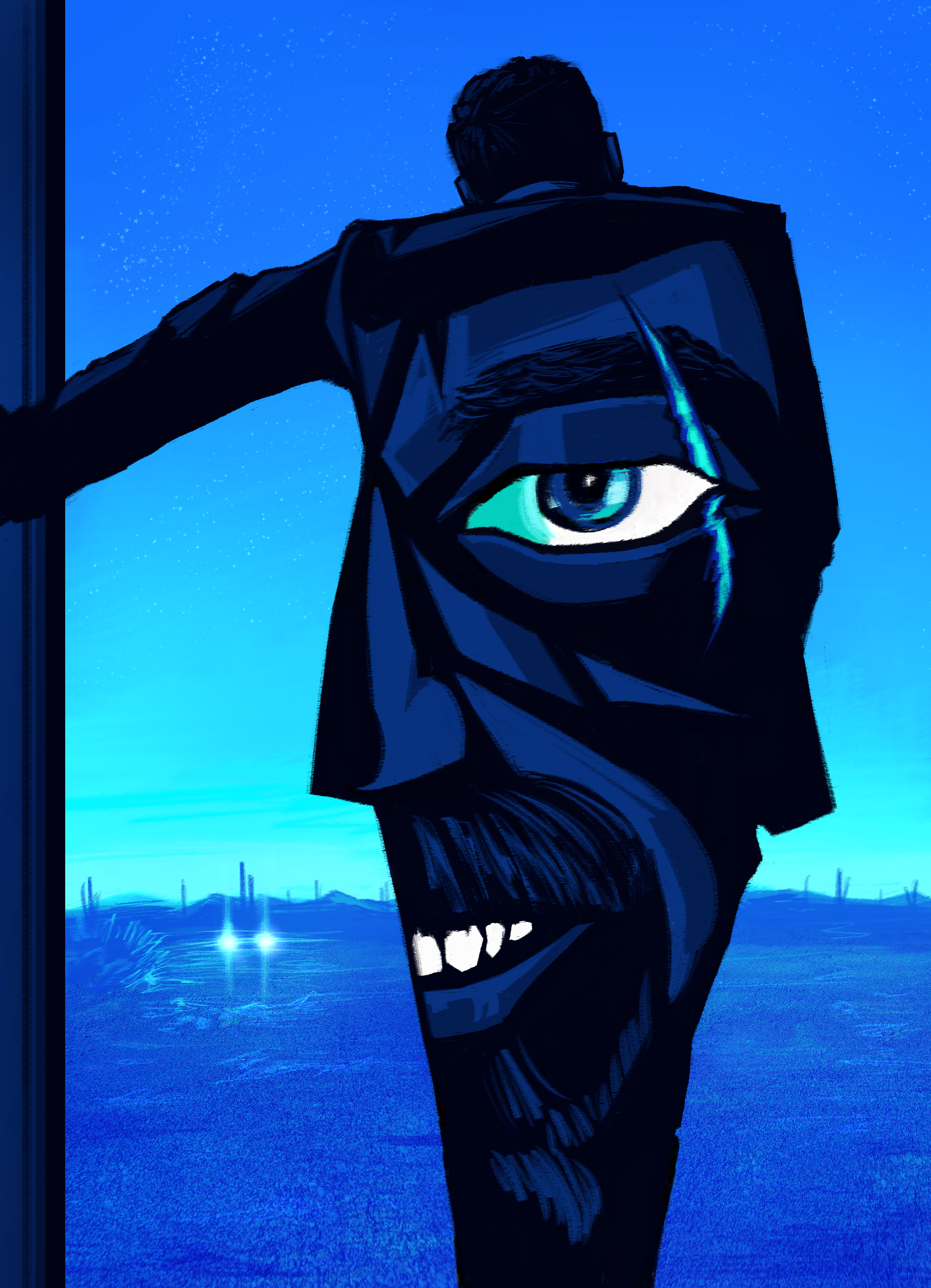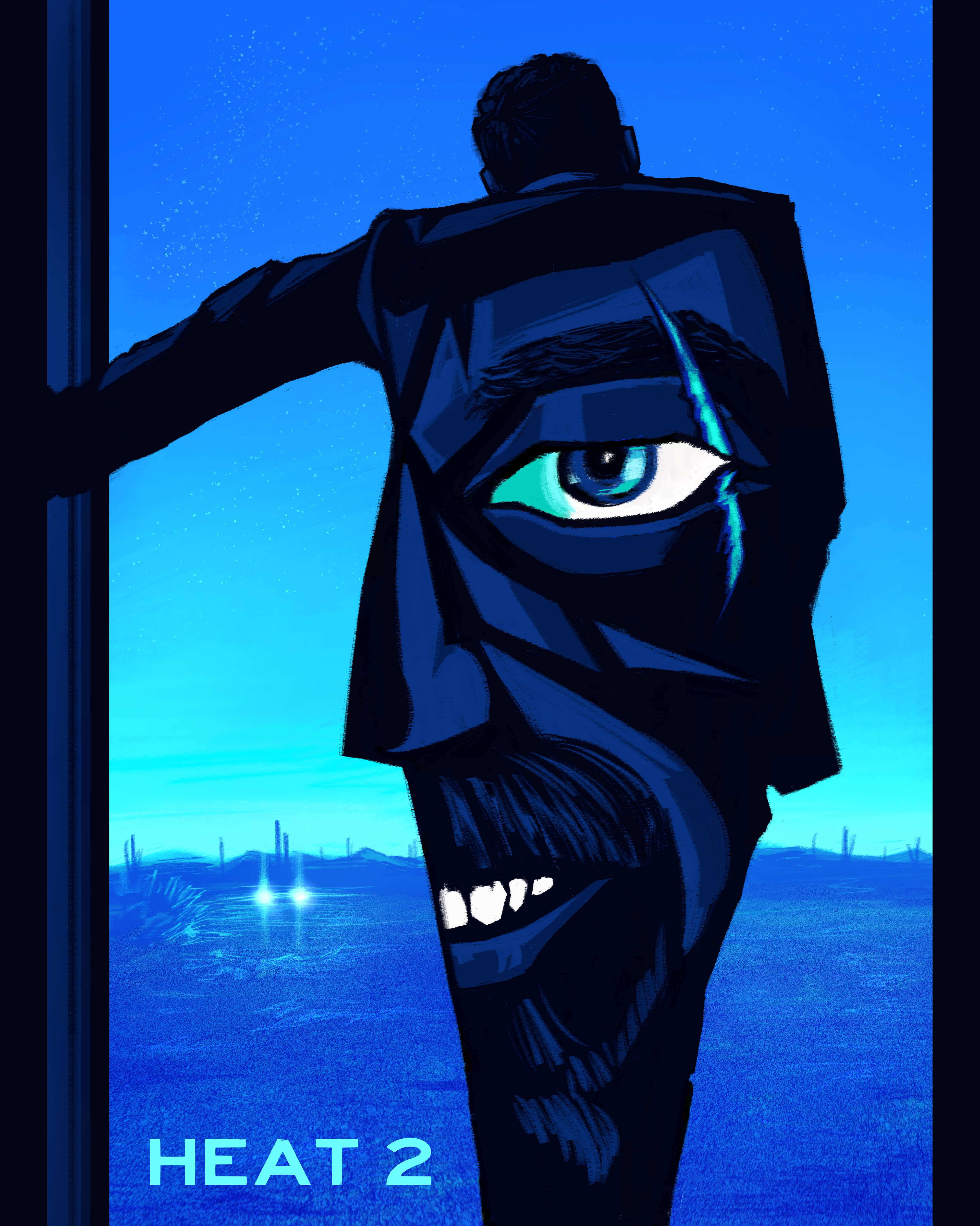 Ultimately, I went for an homage to the scene in Heat (which itself is an homage to Alex Colville) where Neil contemplates his life in the doorway of his empty Los Angeles home. The imagery is one that many find synonymous with the film, so by repurposing it in the setting of Heat 2 with Otis' grin inside the silhouette, I could convey his haunting, shadow-like role in both Neil's life and the story as a whole.