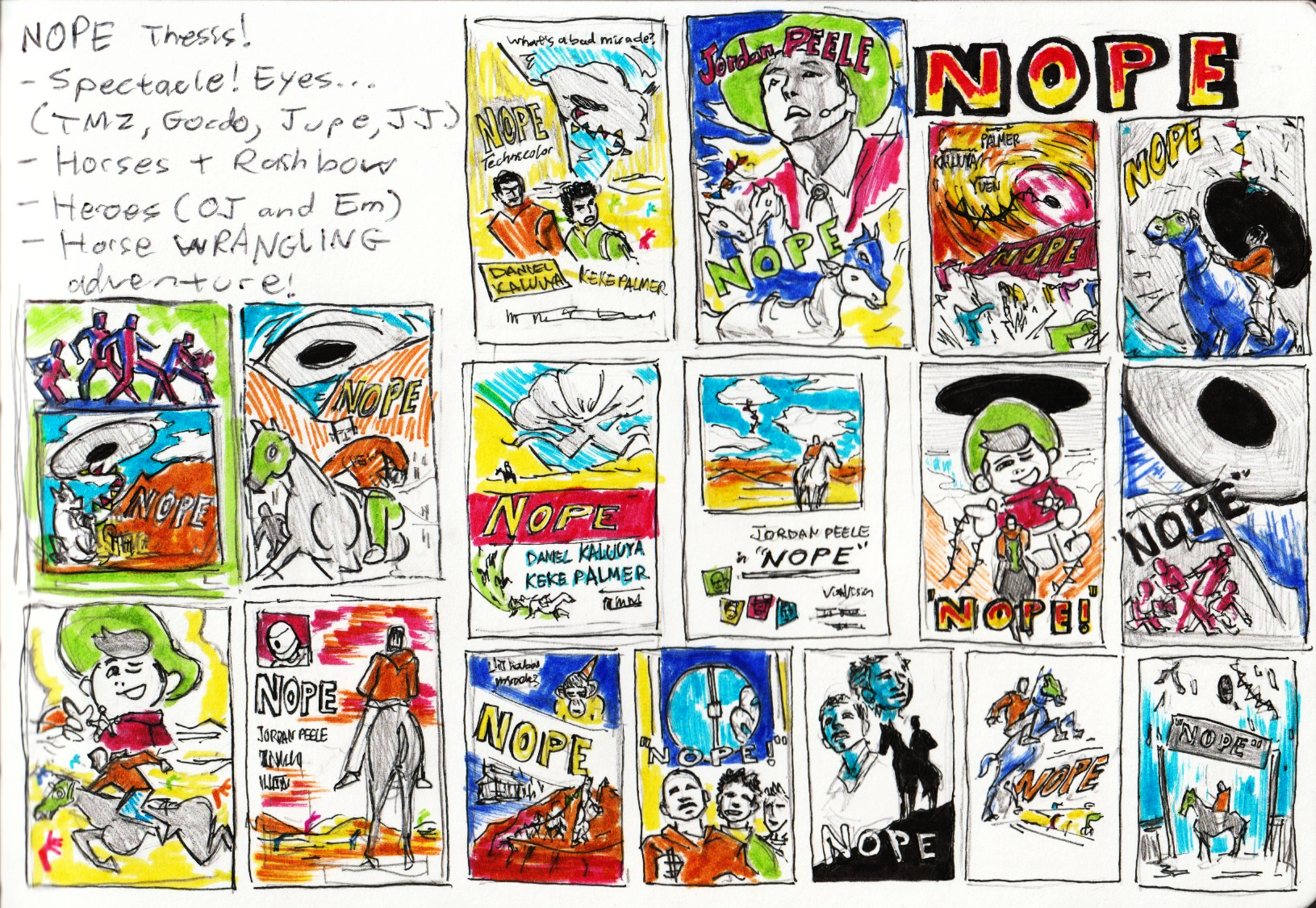 Nope seemed to have a straightforward trajectory in terms of what direction I could take it, with the Western imagery of the movie being prominent enough to make into a poster. However, as I developed the tight sketches, I realized that I was straying further and further from the old “lone cowboy” archetype of Western posters and finding myself in more “monster-movie” territory, which luckily gels better with the subject of the movie.