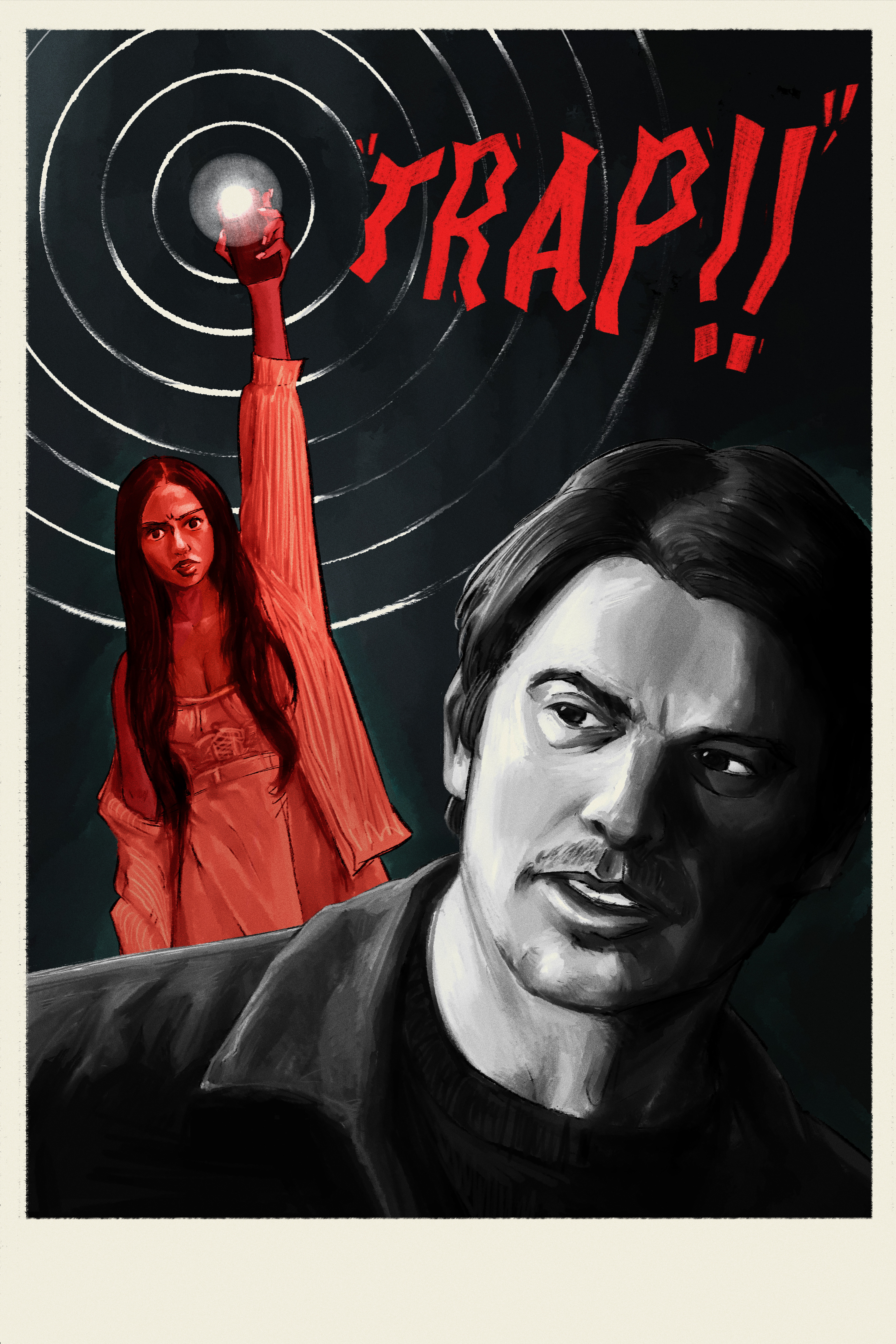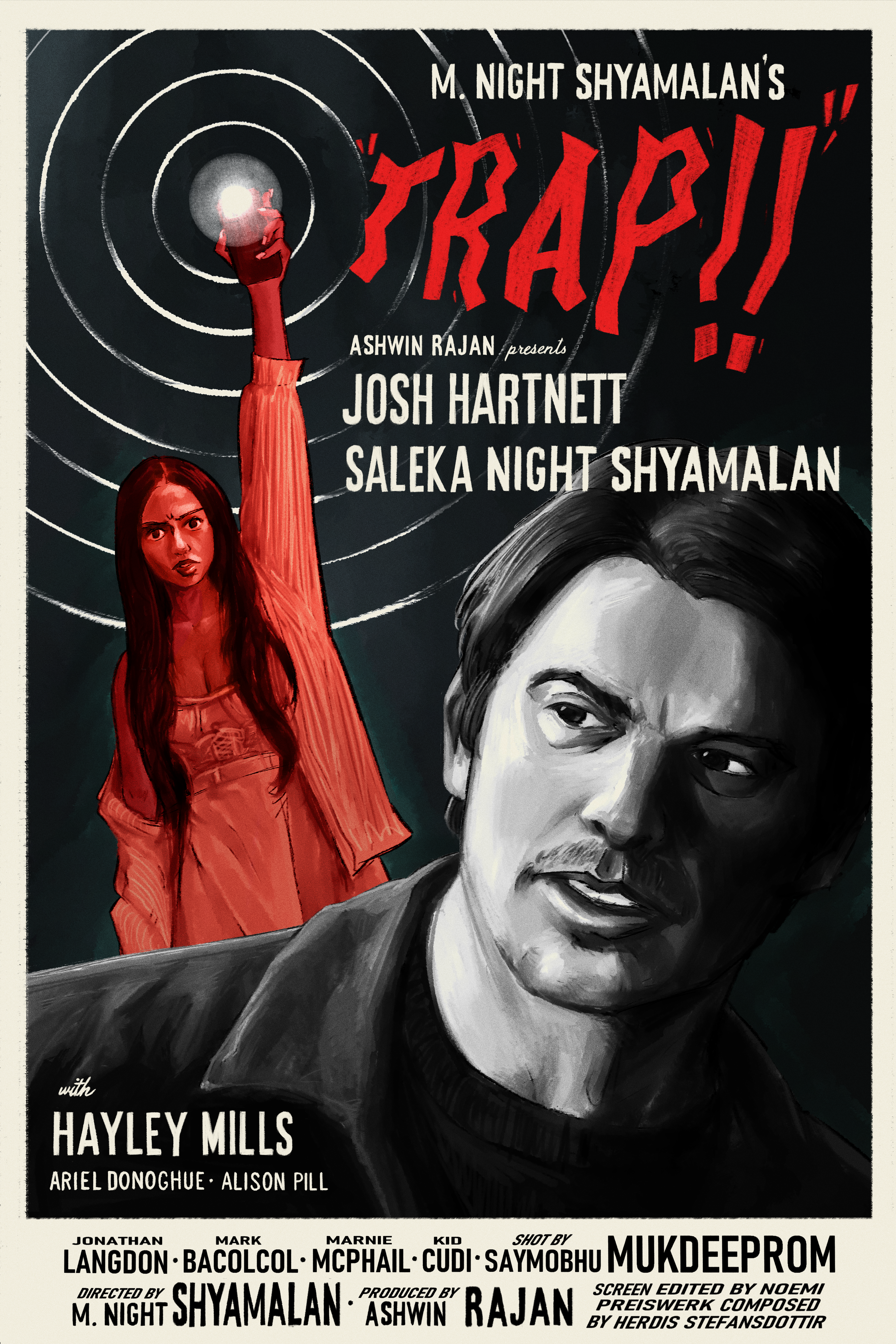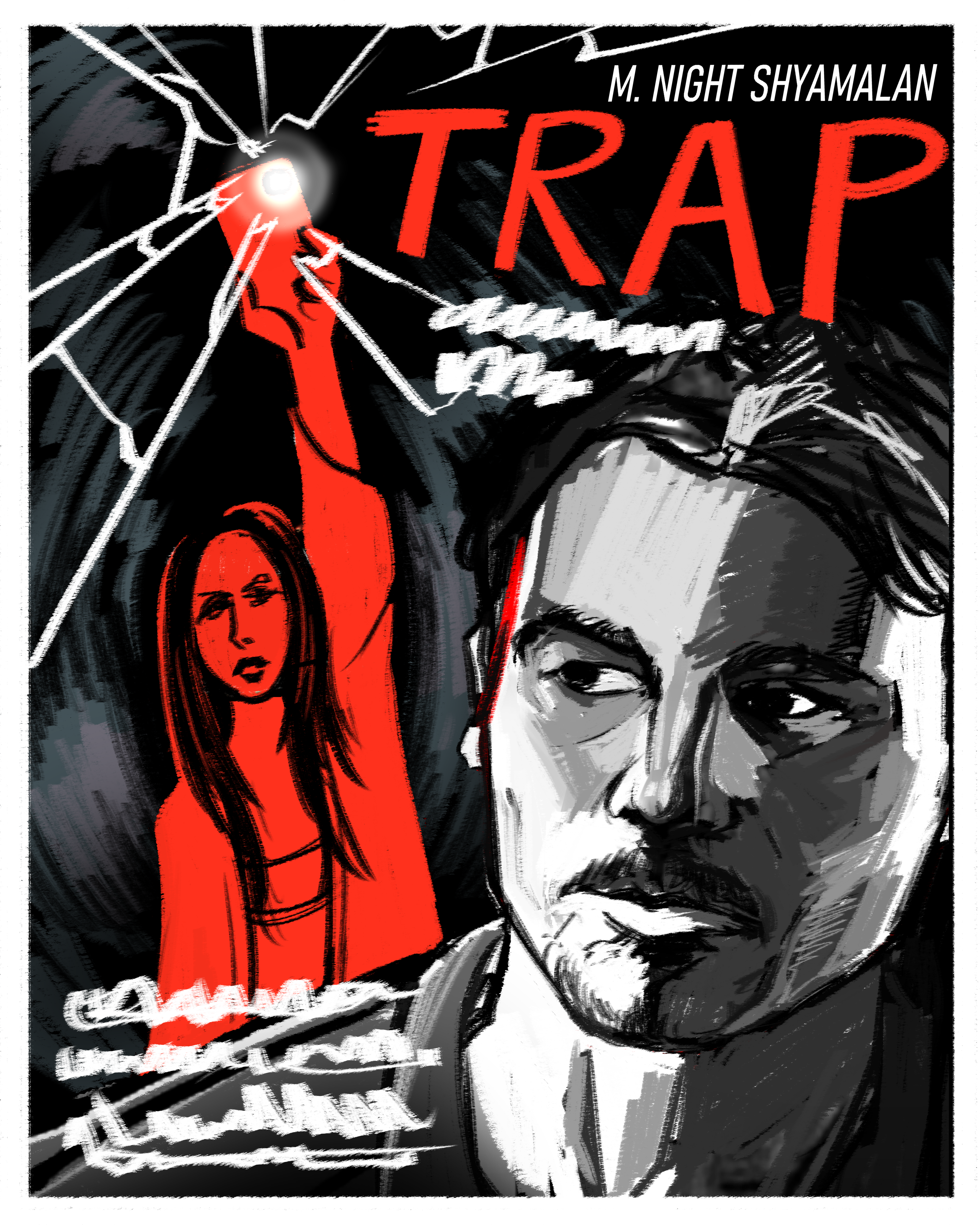The impetus for this poster began as a poster series I developed revolving 2020's films illustrated in the midcentury/golden-age style of cinema posters. The rules were simple: 1) Movies selected must have a subject matter that directly pertained to our modern age (phones, the internet, etc.) and 2) Each movie must be no more than 10 years old. For the first entry, I chose to design a pulpy, kitschy noir style poster for one of my favorites of the decade, M. Night Shyamalan's 'Trap.'